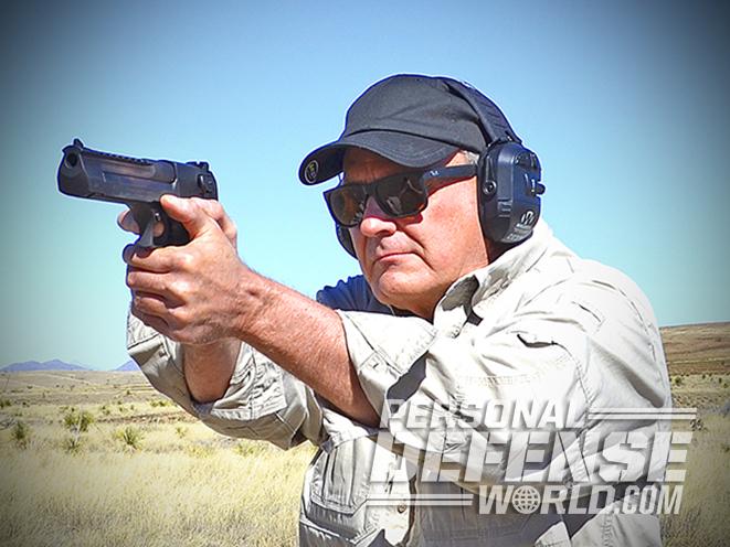 Over the course of a couple of outings, I discovered that my time between shots and accuracy improved vastly from my first session. A firm firing grip must be maintained for the gun to operate properly, otherwise you’ll induce a failure-to-feed malfunction. Shooting groups from the bench, I ended up pushing into the gun, leaning as far forward as possible and locking my wrists and elbows so my shoulder would absorb as much of the recoil as possible. I used my left hand to apply pressure to the front of my right hand. This technique produced the best groups, and I was amazed to see that the Desert Eagle, in both calibers, outshot many of my custom high-dollar 1911s.