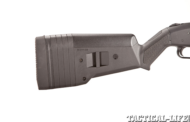 The Magpul SGA stock’s sling attachment point does sit towards the rear of the stock, assisting in the consistent placement on the user’s body, with the firearm sitting mostly flat against the against the body and the buttstock sitting near the shoulder area. The main difference between the Magpul SGA stock and an adjustable AR-style buttstock offered in the Mossberg 590A1 series is this rear sling attachment point. The adjustable buttstock allows for the hinge point of the rifle to consistently stay in the pocket of the shoulder. The SGA stock does not do that to an extent. The butt of the shotgun does sit near the shoulder, but there is still some space that requires movement.