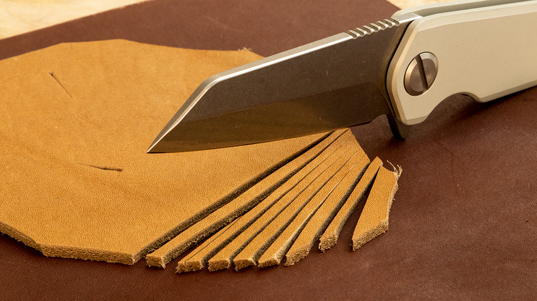 To start, I decided to check the tip sharpness and slice thin strips from some heavy-duty leather I have on hand. Although the leather is almost as thick as the blade itself, the tip sliced off the thin strips like butter.