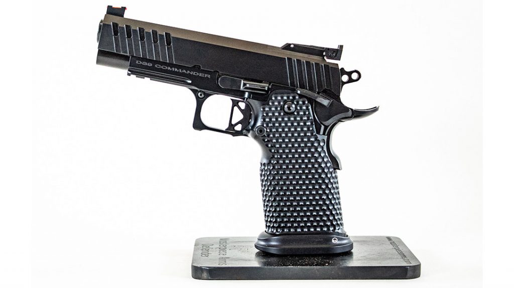 The components of the DS9 Commander are machined in the USA from Barstock and Billet. In addition, keeping the pistol clean and pristine, the parts include no MIM, castings or forgings. The parts machined by MPA (MasterPiece Arms) include the light rail frame, TriTop slide, 4.25-inch MPA 416R stainless bull barrel, stainless beavertail/grip safety, stainless ambidextrous safety, stainless slide stop, firing pin stop, ejector, carry magwell and 7075 black anodized aluminum grip.