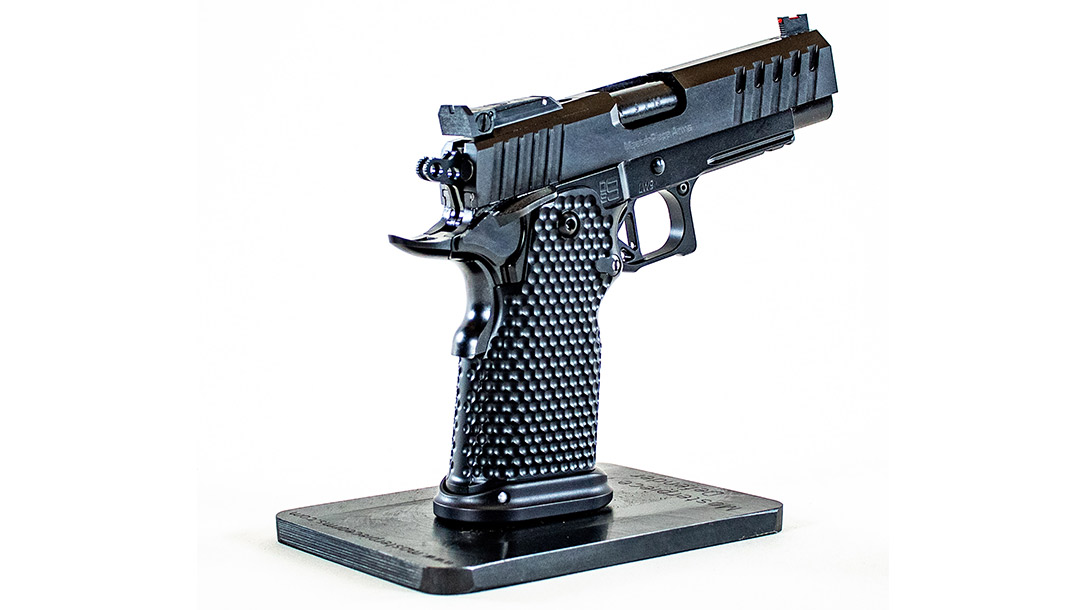 The components of the DS9 Commander are machined in the USA from Barstock and Billet. In addition, keeping the pistol clean and pristine, the parts include no MIM, castings or forgings. The parts machined by MPA (MasterPiece Arms) include the light rail frame, TriTop slide, 4.25-inch MPA 416R stainless bull barrel, stainless beavertail/grip safety, stainless ambidextrous safety, stainless slide stop, firing pin stop, ejector, carry magwell and 7075 black anodized aluminum grip.