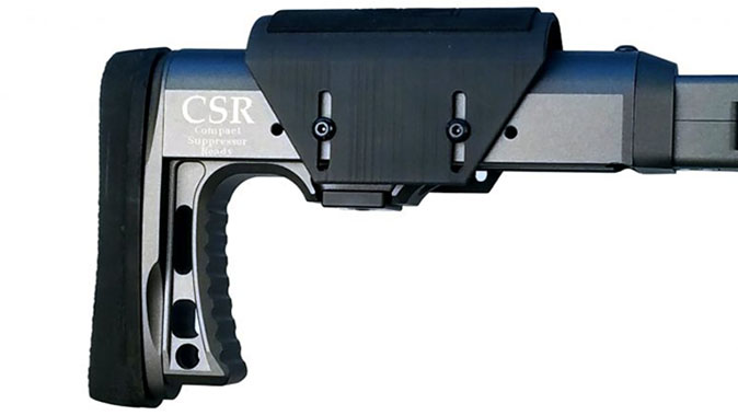 Meanwhile, the gun has a Compact Suppressor Ready buttstock with an adjustable length of pull. The buttstock is capable of storing a suppressor measuring up to 1.5 inches in diameter and 8.5 inches in length. This, the company says, takes a suppressed rifle that measures up to 48 inches and reduces the OAL to 23.5 inches with the suppressor stored in the buttstock and folded/locked in an SBR configuration.