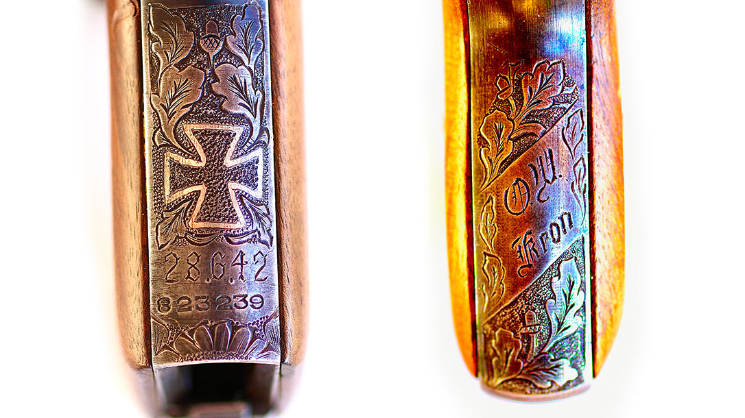 This 7.65mm Mauser, #823239, is a Model HSc made in 1942. It features 100 percent engraving in a typical German “oak/acorn” pattern along with a hand-engraved date, 28.6.42. The date sits above the serial number on the front strap. This is the date he was awarded the Knight’s Cross during Operation Barbarossa.