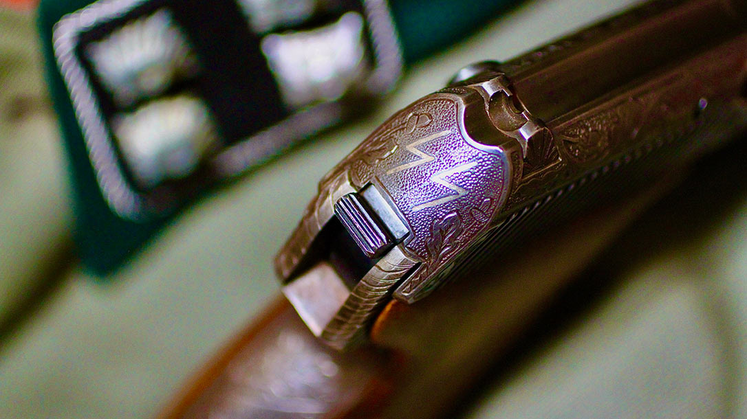 Above this date, engraved oak leaves surround the silver inlaid Knight’s Cross. On the pistol’s backstrap is an angled banner hand engraved with “O W” above Kron. The rear of the slide contains two inlaid silver runes, also surrounded by oak leaves.