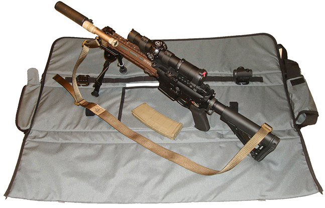 The Universal Case was designed with a 16-inch or shorter barreled carbine in mind, but by incorporating ends that open, longer rifles or accessories can be carried. The ends of the case open allowing the case to fold flat to provide a clean, padded work station while at the range or extended urban observation positions.