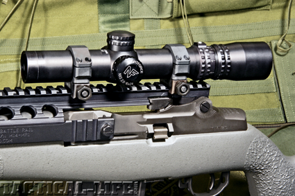 The McMillan M3A was equipped with a Nightforce NXS 2.5-10x24mm scope, but the rail will accept about any aiming device. Note that the rail eliminates the rear aperture sight that is standard on M1As.