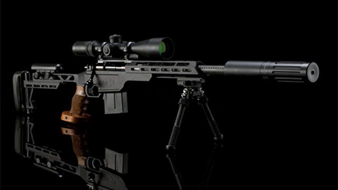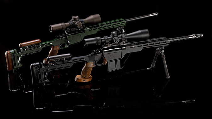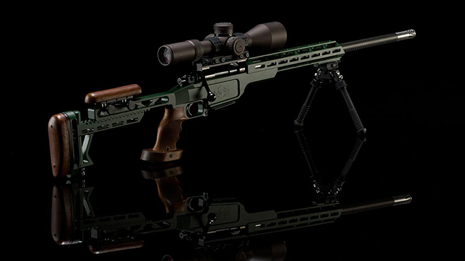 The Vanquish sports a British Racing Green finish, with tan leather on the cheek and recoil pads. It has a 24-inch barrel. Furthermore, it also features an extended forend with M-LOK accessory slots. is touted as being suited for long-range shooting and hunting. The Wraith is the more compact, practical offering. It features a 17-inch barrel; shortened forend; enlarged bolt knob; and is designed to work with an over-barrel suppressor.