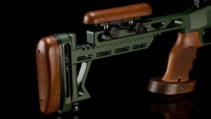 Meanwhile, the contoured walnut grip offers a palm swell with finger grooves and a hand stop. Additionally, the stock has an adjustable length of pull. The adjustable cheek piece is hand-crafted in leather, offering up a comfortable cheek weld. The rear of the stock also has a spring tensioned micro adjustable integral monopod for both range and field use.