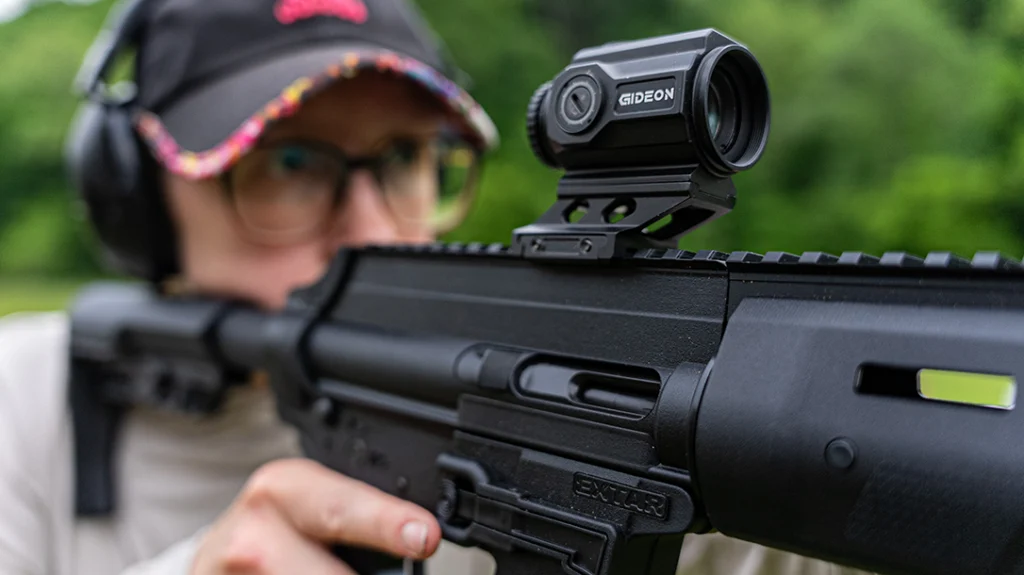 I rarely shoot micro-prism scopes, so the Gideon Optics Advocate mounted on my EP9 was the first I’ve used in a long time. For the price tag of just under $300, I think the value is worth it. I really appreciated the Advocate’s etched reticle, so even without power, the shooter keeps the reticle. That said, the Advocate’s reticle is also illuminated in either red or green. Gideon ships these with 1913 Picatinny riser rail mount which is greatly convenient. The included mount made it simple to install the Gideon Advocate on the EP9 in seconds.