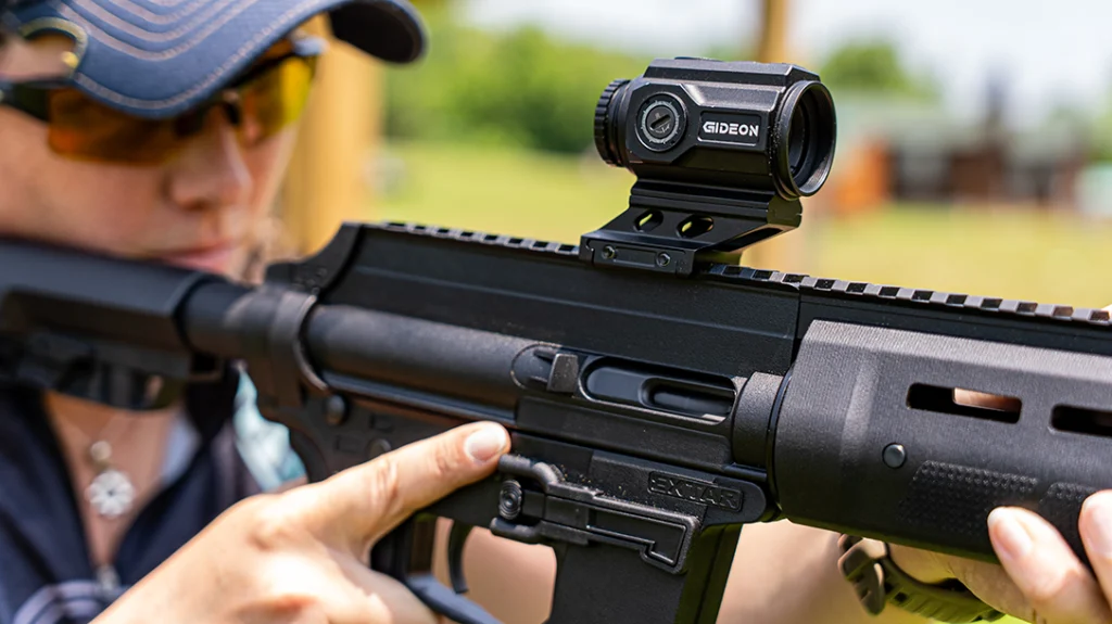 The Extar EP9 carbine weighs 5-lbs, 2-ounces unloaded. Most comparable PCCs with the same barrel length are roughly two pounds heavier. I kept my EP9 slick besides mounting a Gideon Advocate Micro Prism Scope; it added only ½ pound. The women at my event were shocked to try different carbines prior to shooting the EP9. Many appreciated the gun’s lightweight design. By using a shorter Glock magazine, the EP9 also became easier to hold.