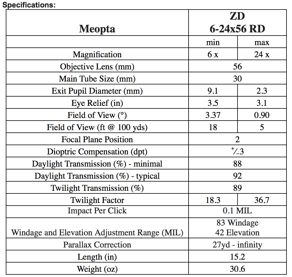 Meopta’s proprietary MeoBright lens multi-coatings eliminate glare and reflections and deliver 99.7 percent light transmission per lens surface while the MeoQuick fast-focus eyepiece rapidly brings targets into sharp focus. MeoShield ion-assisted coating protects external lens surfaces for enhanced resistance to scratching and abrasion in extreme conditions and meets military specifications for durability and surface hardness. This scope also features an anodized exterior for scratch resistance and is waterproof, shockproof and fogproof for maximum performance and durability. The ZD 6-24×56 is covered by Meopta’s North American lifetime transferable warranty.