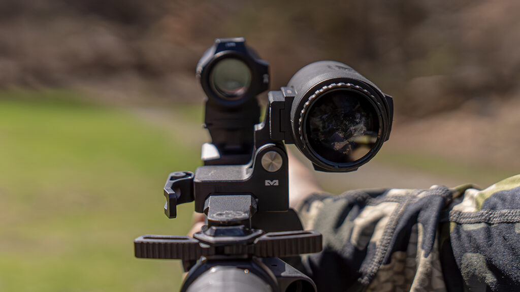 I happened to have one of Holosun’s newer optics, the Solar Charging Rifle Sight (SCRS), which comes mounted on a 1.63-inch riser. What I love about this optic is it is available in the Multiple-Reticle System (MRS), which gives you the choice of using a 2 MOA dot, a 65 MOA circle, or both together. The Meprolight MMX4 with this powerful reticle system was the winner of the combinations I tried. It doesn’t matter if you prefer green or red for your optic selection, as the Meprolight magnifiers have good clear glass that doesn’t change or affect the reticle’s color.