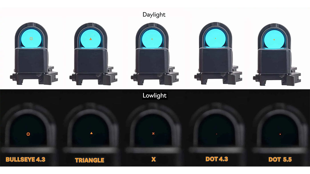 Aiming Point Diameter: 4.3 MOA/ 5.5 MOA/ Triangle/ Bullseye/ Open “X” *some options might not be available
