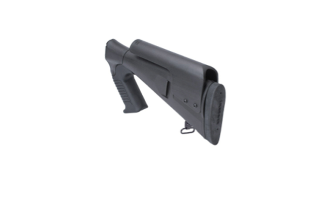 Made from injection-molded glass-filled nylon, the Urbino has a “tactical” 12½ inch length of pull (LoP) for enhanced weapon control and use with body armor; optional field-adjustable cheek riser to provide improved cheek weld when used with optics; optional Limbsaver butt pad for greater shooting comfort, especially during long training or certification courses; shock-absorbing over-molded rubber grip to reduce shooter fatigue; and a variety of standard and proprietary sling mounting options.