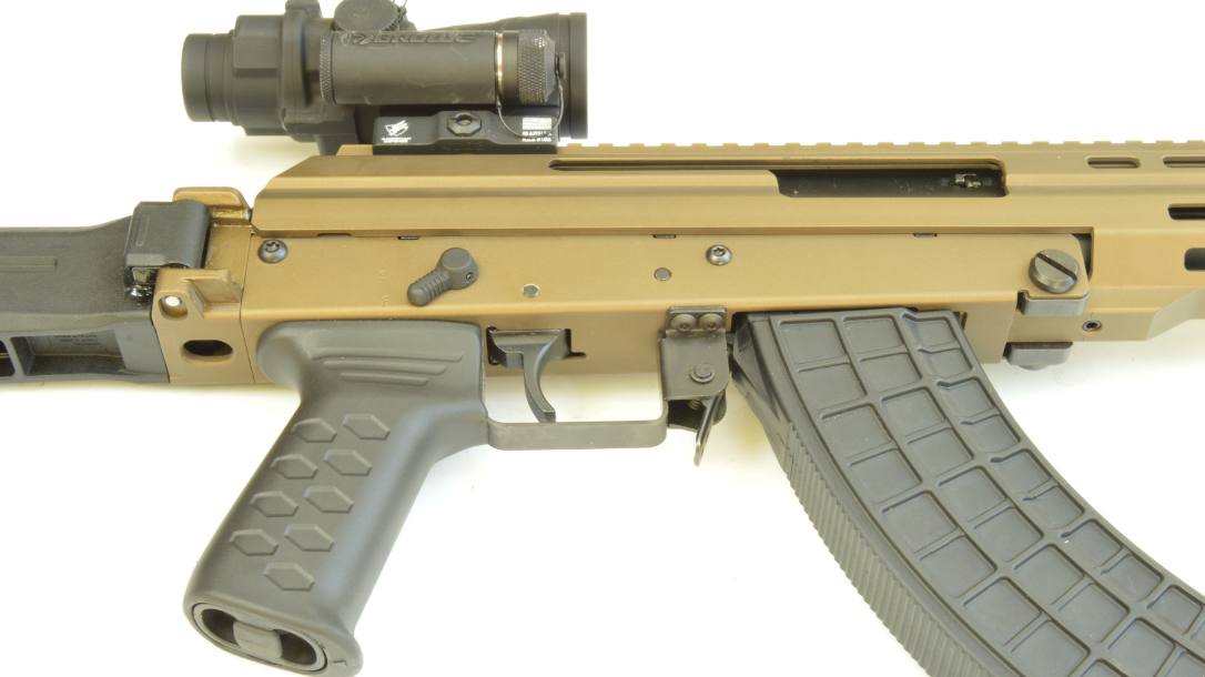 What looks like a sheet metal AKM lower receiver, which also attaches to the lower front of the steel receiver on the barreled action that is the core of this rifle, is made from tough stainless steel and thicker-than-a-typical AKM receiver (1.5 mm vs. 1 mm). Immediately noticeable here is the lack of rivets. Instead, the lower components are attached with Torx head screws. Two advantages come from this. If you have loose fitting magazines, the screws allow adjustment of the magazine catch position to tighten the fit, and, the rear trunnion can be changed out easily to suit your preferred buttstock configuration.