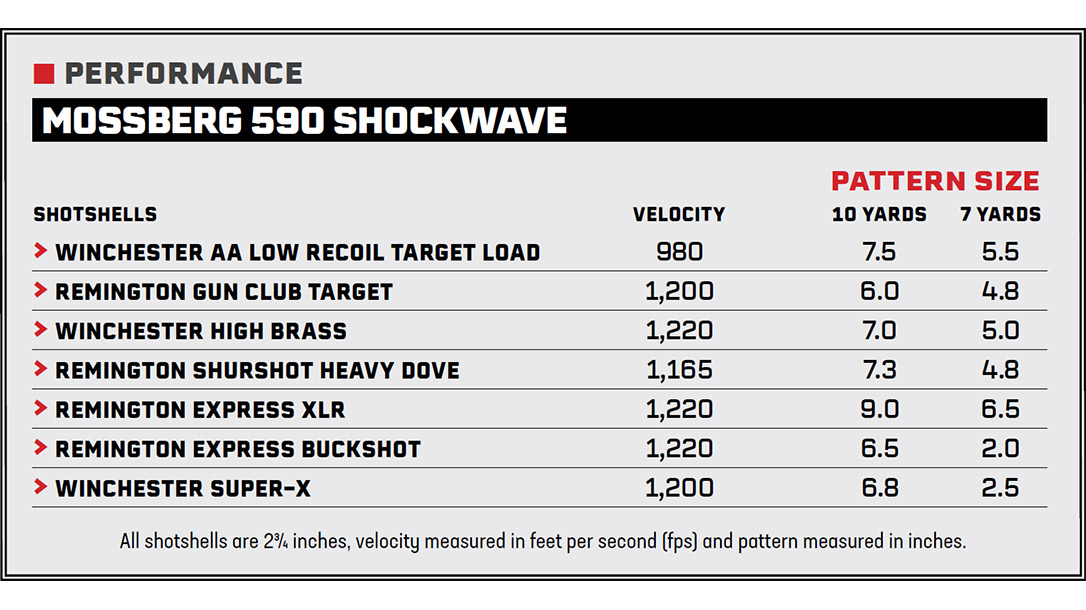 I tested the patterns of a variety of shotshells at 10 and 7 yards. The Remington Express XLR No. 5 shot produces patterns about 9 inches across, which is certainly not hall-filling. XLR buckshot was not readily available in my area, but both Remington and Winchester No. 3 buckshot delivered patterns around 6.5 inches.