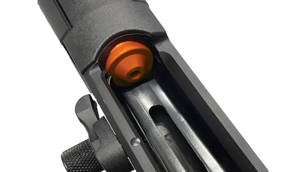 At the heart of the 990 Aftershock is a durable gas-operating system that is fully contained within the forend. Internal parts (gas piston, magazine tube, hammer, and sear). It features a nickel-boron coating and a special finish for enhanced corrosion resistance and smooth, reliable cycling. To further improve performance, the 990 has an enlarged and beveled loading port designed for ease of loading, an elongated, pinch-free elevator, and an anodized, bright orange follower.