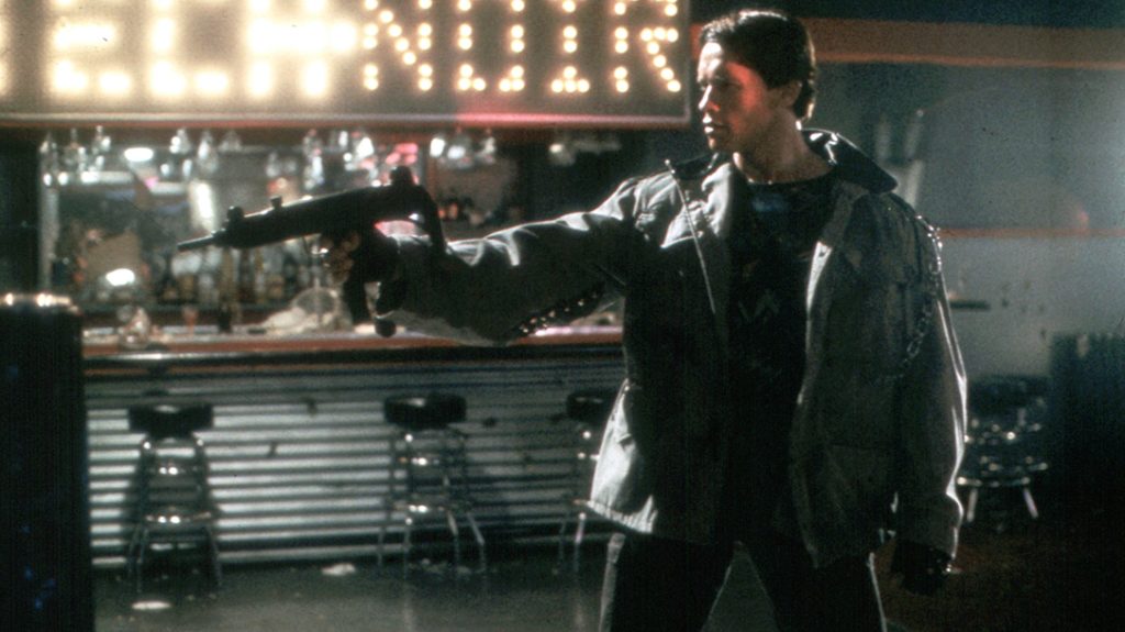 Perhaps the biggest shout-out to the Uzi to date occurred in James Cameron’s 1984 science fiction classic The Terminator when Arnold Schwarzenegger’s T-800 character asks to see various firearms at a Los Angeles gun shop and simply utters, “Uzi 9mm.”