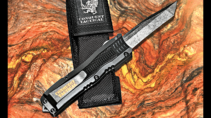Conquest Tactical Fury: The automatic, out-the-front Fury knife from Conquest Tactical features a 3.75-inch blade made using premium-grade 154CM stainless steel, known for its strength, corrosion resistance and excellent edge quality. The durable handle is made of aircraft aluminum with stainless steel internal parts that are precision machined in the U.S.A., and it also features a stainless steel glass breaker. Conquest Tactical knives are sharpened and assembled by hand to ensure top quality and reliability, and accessorized with a pocket clip, plus a nylon sheath with belt and pack loops for easy carrying.