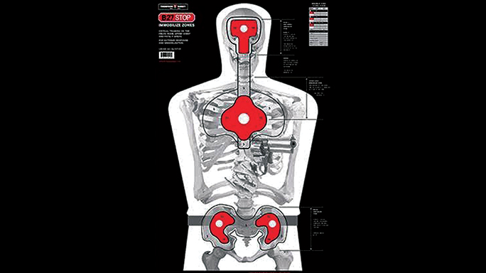 Thompson Target B27STOP: The B27STOP fuses immobilization zone mapping with the widely recognized B27 target style, producing the perfect target for concealed-carry training. What sets this full-torso target apart is its first-of-its-kind design. The assailant’s key immobilization zones are superimposed against the skeletal structure for effective comprehension in extreme response and immobilization training. The detailed scoring zone meets tactical training specifications, and each immobilization zone is mapped out with measurements and specialized teaching to improve understanding of shot placement and its effect.