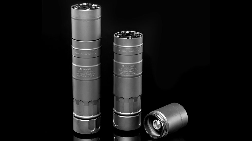 The Micro 30 is modular and features a Stellite core as well as a 17-4PH stainless steel tube and mount. The Micro 30 has a 7.62mm bore, is 1.5 inches in diameter, and 5 and 6.5 inches long in short and standard configurations, respectively. This suppressor was designed specifically for reducing sound at the shooter’s ear when using gas-operated weapons to account for the effects of backpressure. Rugged’s tests show that sound levels at the ear using the standard-length Micro 30 were 123 and 131 decibels for 300 Blackout and 5.56mm NATO rounds, respectively. (ruggedsuppressors.com)