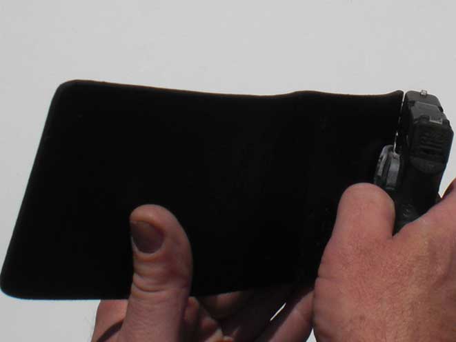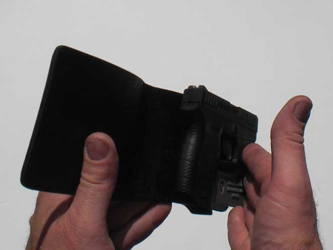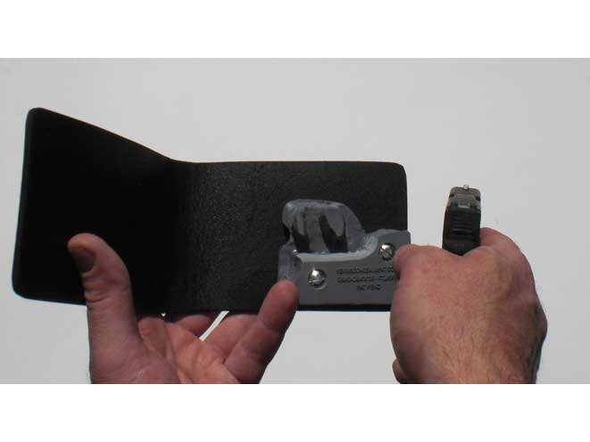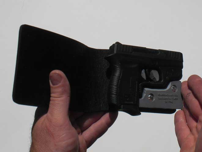 Washington-based Kevin’s Concealment Holsters has released a new full-concealment wallet holster for carrying at work or campus where legal. This unique, patent-pending design uses a plastic retaining insert to hold the pistol in place when the leather cover is closed. The right-hand model fits in your left back pocket like a second wallet, so your right pocket can still hold your regular wallet.
