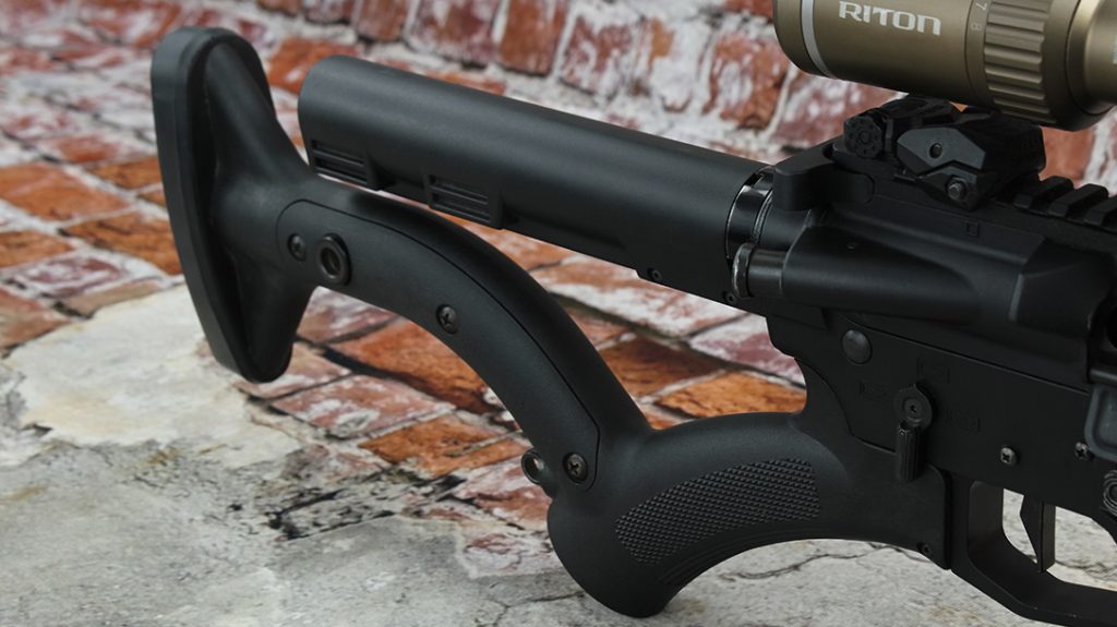 Naturally, plenty of designs have come forth, but most out-of-staters probably are most familiar with the Thordsen stock. Because this elongated gooseneck of a grip sweeps back behind the triggerguard (as opposed to protruding under it) it no longer meets the description of a pistol grip. Most folks like it because it gives a feel of a conventional rifle, but some shooters find it uncomfortable because it rubs against the web of your hand and puts your finger a bit far from the trigger.