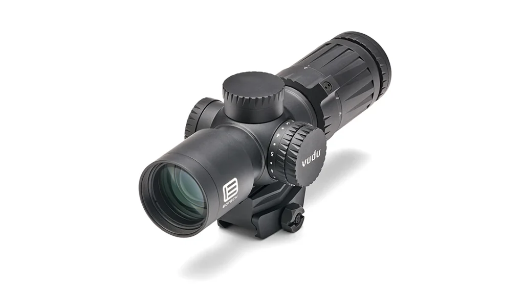 The super short Vudu 3-9×32 rifle scope might just be the perfect optic. The housing is constructed of aircraft-grade aluminum to be compact, lightweight and incredibly durable. This second focal plane design comes in at 6.8 inches and is fog, water, and shock resistant. The turrets offer ¼ MOA adjustments and are both capped for protection.
