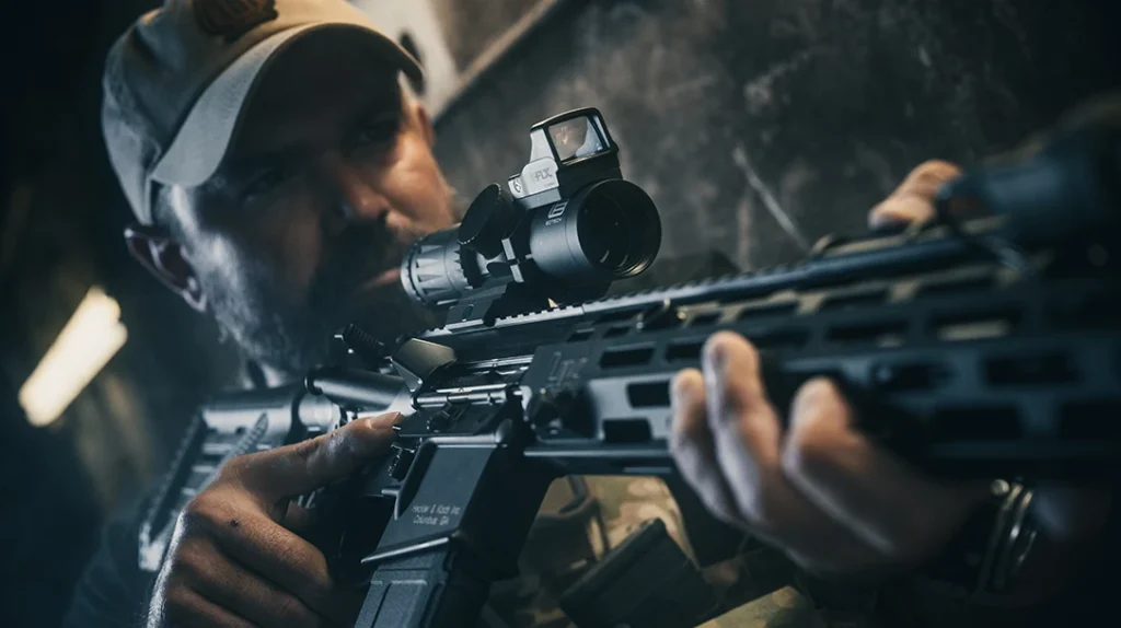 For those wanting a non-magnified solution, EOTech offers a version that includes a ring mount and EFLX that can be mounted to the front tube section. It can be positioned at the 12 o’clock position or at 45-degree offsets for close or moving targets. To find out more please visit EOTechinc.com.