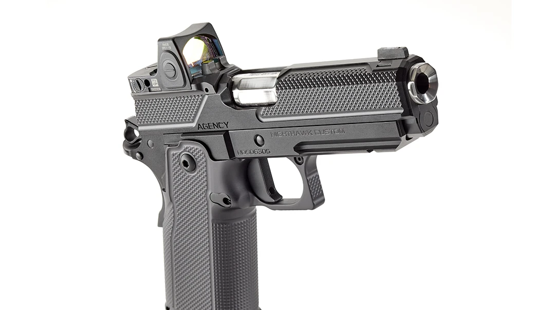 I get why it’s named the Double Agent. If looks could kill, this pistol would surely do the job. I have seen and shot many Nighthawk Custom pistols, but the Double Agent has the most intricately designed texture that’s aesthetically pleasing and practical. Clean lines separate the back strap, front strap, and side grip, but that perfect texturing covers the entire grip.