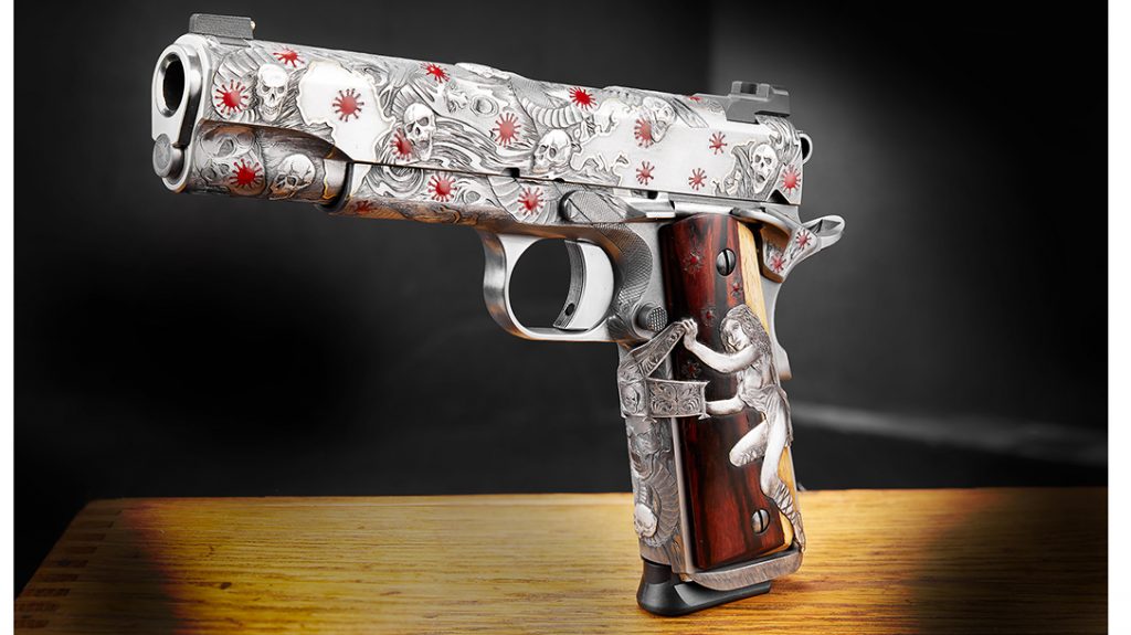 This ornate, finely finished and bejeweled take on the Government Model is a genuine one-of-one creation. Hand-engraved by a German gold and silversmith master engraver, it evokes high-end masterpieces of old. It features a mix of deep 3D relief mixed with the finest Italian Bulino-style engraving. The engraving alone took more than three months to execute, according to Nighthawk.