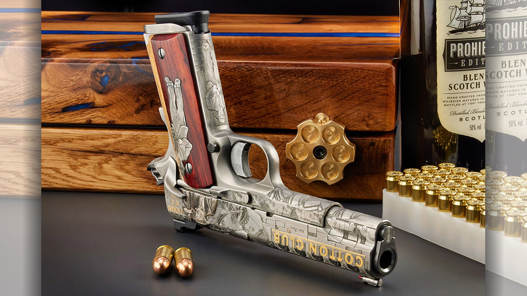 The left side features mafia bosses Al Capone and Lucky Luciano. The front of the slide features the infamous Cotton Club, with the name inlayed in 24K gold, while the frame and dust cover display parked cars. Additionally, the rear of the slide displays Capone and Luciano superimposed over rolls of cash. The grip features bank robber and boot legger John Dillinger in 999 silver.
