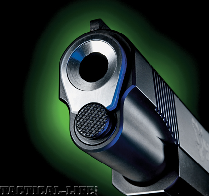 The 5-inch 416D stainless steel match-grade barrel with its 1-in-16-inch left-hand twist rifling has a beveled crown that ends flush with the match-grade barrel bushing. The feed ramp is integral to the barrel and has been polished to enhance feeding, something that is especially important with hollow point ammunition. The recoil spring plug is standard 1911 fare as is the short guide rod.