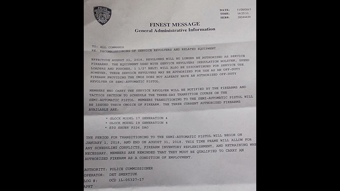 Uniformed officers who carry a service revolver will be required to undergo a three-day “transition course” to the semi-automatic handgun. Once they complete the course, he or she will be given three semi-autos to pick from: the Glock 17 Gen4, the Glock 19 Gen4 or the Sig Sauer P226 DAO. The transition period to the semi-auto will begin on Jan. 1, 2018 and wrap up Aug. 31 that same year.
