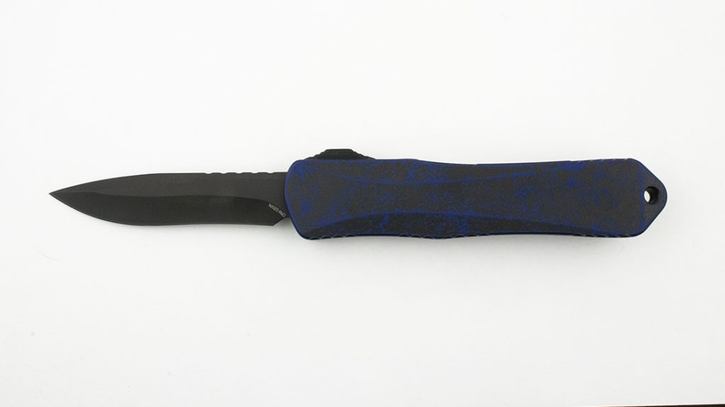 Weighing just 1.51 ounces, the 4850-1 is perfect for formal occasions because it won’t weigh down your dress slacks. With a closed length of 3.4 inches, its smaller size would also lend itself nicely to women’s pants, since they typically have short pockets that might not be able to fit a full-sized OTF. The brilliant blue 6061-T6 aircraft-grade aluminum handle stands out beautifully. It features subtle texturing on the flats and two areas of light jimping on the bottom.
