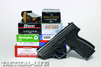 My reloads with Hornady’s 200-grain XTP JHP wouldn’t chamber in the PM45, and 200-grain +P CorBon fared little better. Shooting the +P CorBon was, frankly, punishing. Not only did the pistol recoil violently, it didn’t feed well, and the higher-pressure round magnified the pistol’s occasional tendency to kick empty brass back into your forehead—in this case, hard enough to actually draw blood.