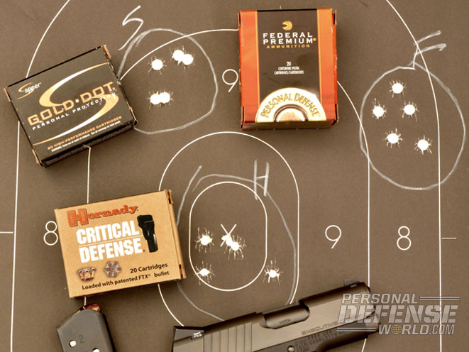 For the Para Executive Carry test, three leading defensive brands of ammunition were used: heavy-hitting Federal Premium 230-grain Hydra-Shok JHP, Hornady Critical Defense 185-grain FTX and Speer Gold Dot Personal Protection 185-grain GDHP. All three functioned flawlessly in the Para, which also has an oversized, flared ejection port on the shortened slide. Recoil/muzzle lift was fairly even across the board with all rounds striking very close to POA. There was a prevailing wind averaging 11 mph, bright sun and an average temperature of 52 degrees. Sighting in took only a few rounds as the gun proved very consistent regardless of ammo.
