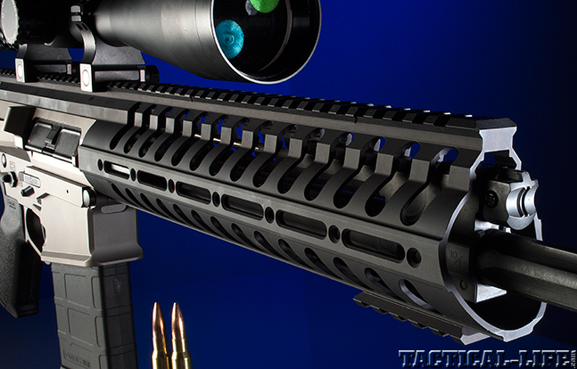 The MRR is made of aluminum and has a smooth contour except for the Picatinny rail along the top. However, there are numerous attachment points at the 3, 6 and 9 o’clock positions for five-, 12- or 17-slot sections of rail to which can be attached any number of accessories like bipods, tactical lights, lasers or vertical foregrips. The shooter can put rails only where desired and leave the rest of the MRR smooth so it is comfortable to grip.
