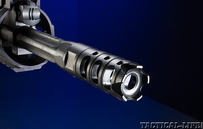 POF uses high-quality finishes and parts in its guns. The barrel of the P308 is available in a variety of lengths out to 20 inches, and is button-rifled with a 1-in-10-inch twist rate and then hand-lapped for accuracy. It and the huge heat-sink barrel nut are fluted to increase the cooling surface area and make the barrel stiffer compared to a barrel of the same weight. The barrel is made of 4150 chrome-moly-vanadium steel that is hardened and then salt-bath-nitride treated, making it harder and more corrosion resistant than hard chrome plating. The muzzle is crowned, and a very effective, triple-ported POF muzzle brake is attached.