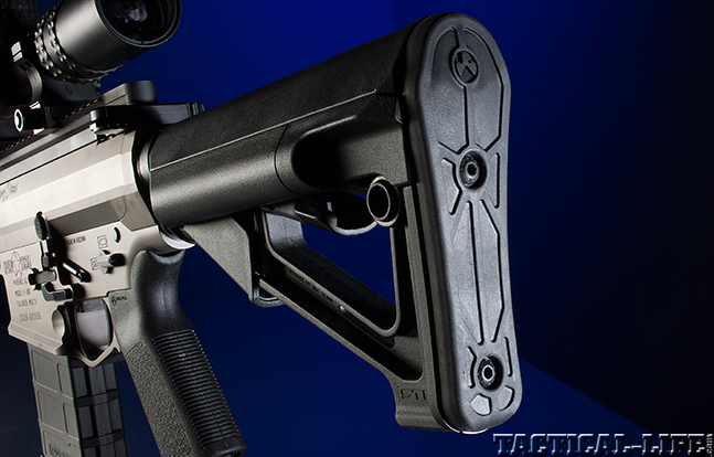 The P308’s furniture consists of a Magpul MOE pistol grip and a Magpul STR seven-position-adjustable stock. The stock rides on a receiver extension that has a tab at the front that is slotted and captures the buffer retaining pin, locking the tube in place so that it cannot rotate in the unlikely event the castle nut becomes loose. Because the tab or lip extends under the back of the bolt carrier group when the gun is in battery, the tail cannot tip down at the beginning of its rearward journey and carrier tilt is eliminated. It’s pretty ingenious.
