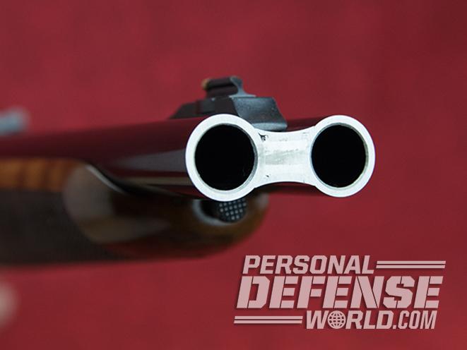 If you are familiar with double-barreled shotguns, you will feel at home with the Howdah. On top of the gun, and just behind the barrels, is an unlocking lever. When pushed to the right, this lever allows the barrels to tilt down and expose the chambers. The chambers accept standard .45 Colt round and both 2½-inch and 3-inch .410-bore shells. An integral extractor helps you to remove fired shells.
