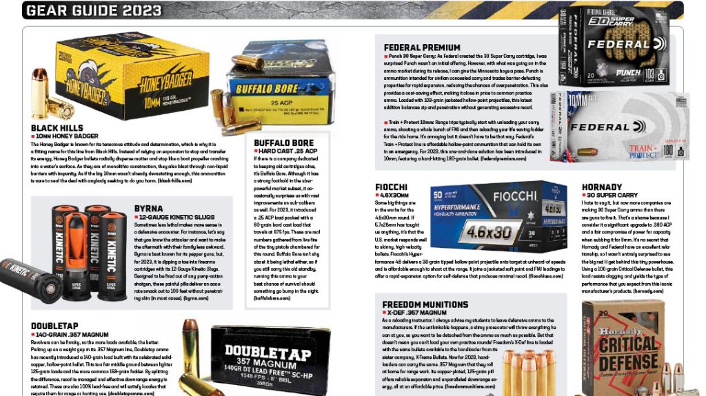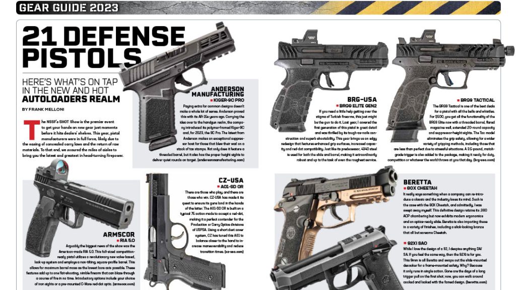From the MC2c (p. 26) to the Ruger Security 380 Lite Rack (p. 52) to the Canik METE MC9 (p. 58), there’s something for everyone wanting to upgrade their CCW line-up this year. And if that’s not enough, our feature on 21 new defensive pistols for 2023 (p. 82) should have plenty of great guns to pique your interest.