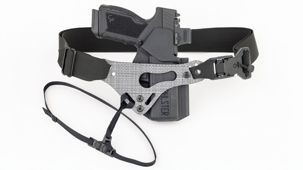 The belt utilizes a quick-attach/detach magnetic clip for quick, easy system attachment or removal. Additionally, a leg strap helps secure the holster firmly in place.