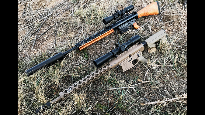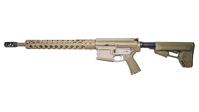 The rifle features an 18-inch custom profiled Douglas barrel with a 1:14 twist and eight grooves. It also boasts a billet 7075-T7 aluminum upper and lower, in addition to a custom trigger and a Phoenix Weaponry’s custom “Chevron” muzzle brake CNC machined from 4130 chromoly. Weighing in at just over nine pounds and measuring 41 inches in overall length, the gun also sports a Magpul ACS Stock in FDE; Magpul MOE pistol grip in FDE; standard .308 BCG; CNC-built 15-inch free-floating modular handguard; billet dust cover; standard .308 charging handle; and a 10-round Magpul magazine modified to a 6-round capacity for the .45-70.