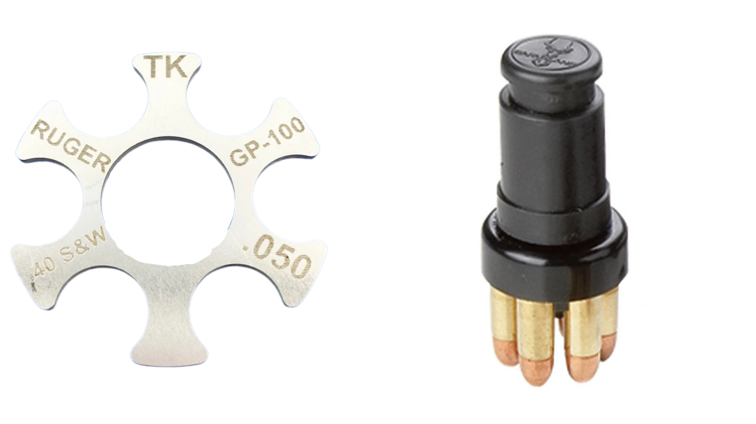 First, we have the Ruger GP100 Match Champion in .357 Magnum. Its rival from Smith & Wesson is the 686 SSR, a special model from S&W’s Performance Center lineup. Both of these revolvers are chambered in .357 Magnum, and use speed loaders to hold spare rounds. Most top shooters use either Safariland Comp-III loaders like the one pictured or the harder to find Jet Loader for these guns.