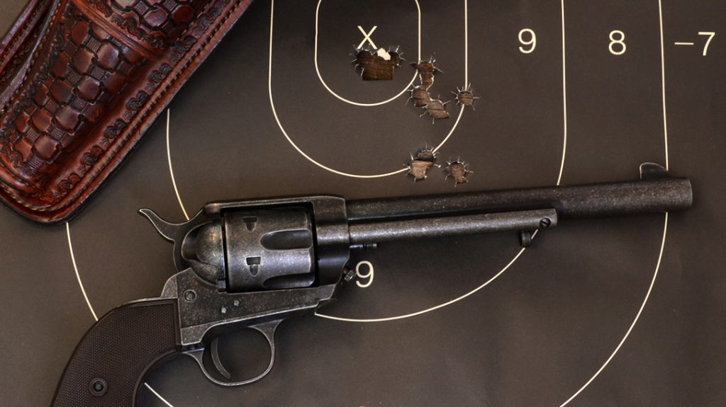 Most gunfights were at close range, but to test the accuracy of the Pietta, the target was set out at 45 feet. This is technically close range for a 7.5-inch barrel. I shot my five rounds (keeping one chamber empty in Old West tradition) one-handed. Drawing and aiming each shot, then re-holstering and repeating.