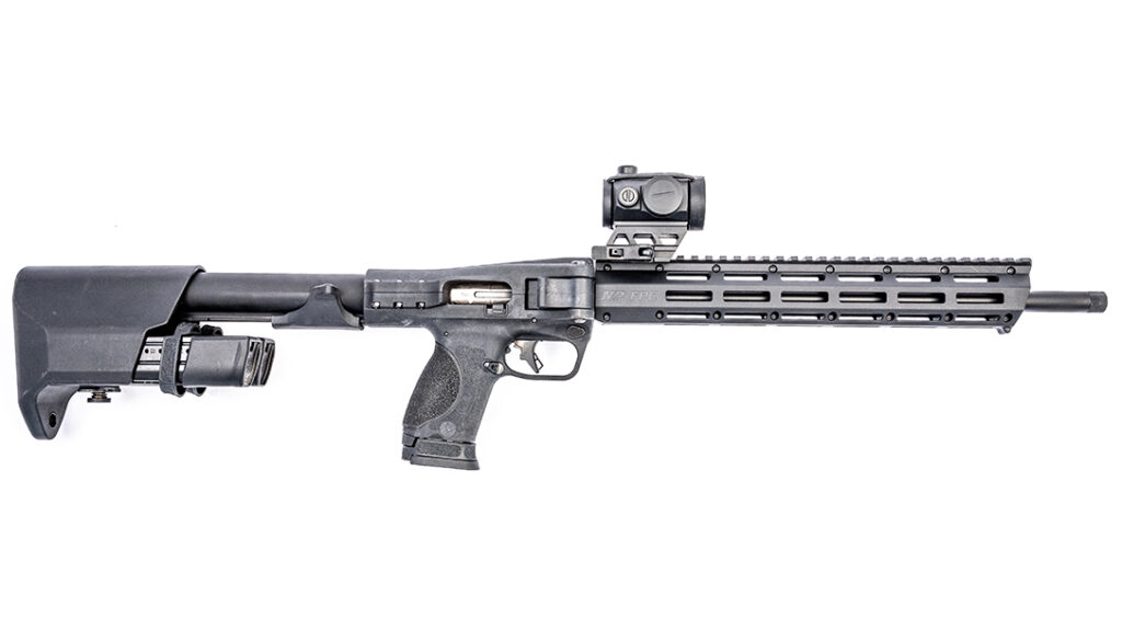 Other features include a flat-faced trigger with a crisp break, a threaded muzzle with a thread protector, a reversible magazine catch and M-Lok slots on the handguard. The charging handle/slide doubles as a retainer with the gun folded, ensuring it stays put until the user deploys it again. (smith-wesson.com)