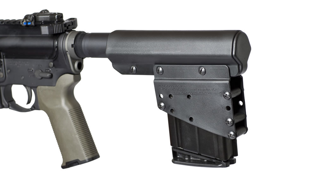Designed to fit on an AR-style pistol buffer tube ideally ranging from 1.18 inches to 1.25 inches in diameter, the Pistol Storage Device lets you store items like slings, tourniquets and a variety of magazines (see below).
