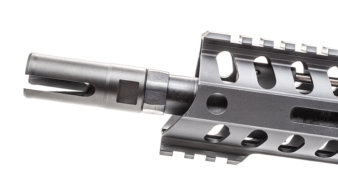 POF-USA has its barrels 5R rifled with a 1-in-8-inch RH twist and cuts the chamber to NATO specs. Barrel blanks are profiled in-house and nitride heat-treated for corrosion resistance and a longer life. The Minuteman uses DeSomma’s E2 dual-extraction technology, which involves cutting four narrow channels into the neck area of the chamber. When the gun is fired, a small amount of gas vents on the casing’s shoulder, breaking the seal between the chamber and case, and reduces the amount of work the extractor must do. The muzzle of the barrel is threaded at 1/2×28 and is outfitted with POF-USA’s effective three-prong flash suppressor.