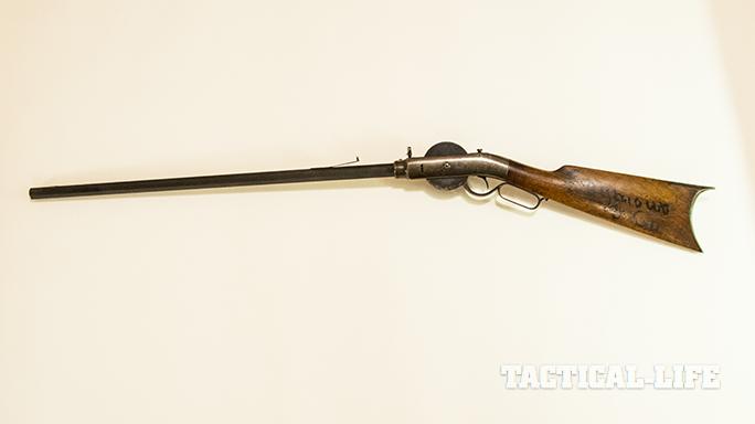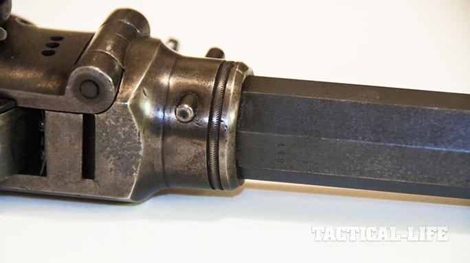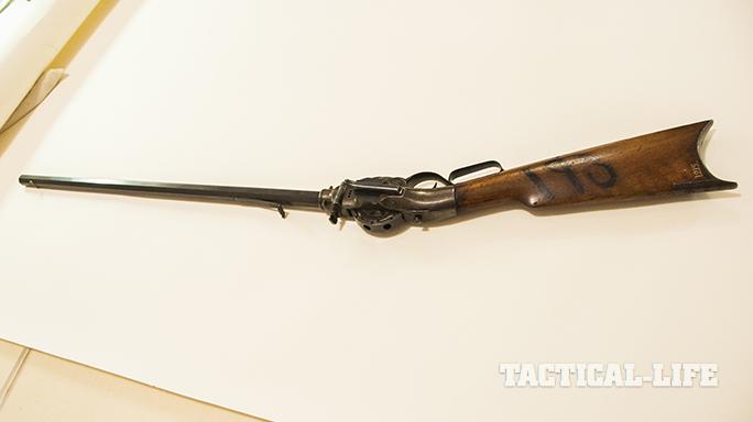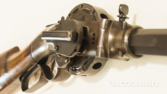 The turret was rotated and locked by the lever, and in this regard the design was successful at least in how individually loaded chambers on the perimeter of the turret were ignited by a self-priming, side-hammer mechanism. That made the operation of the rifle smooth and reliable—at least in theory.